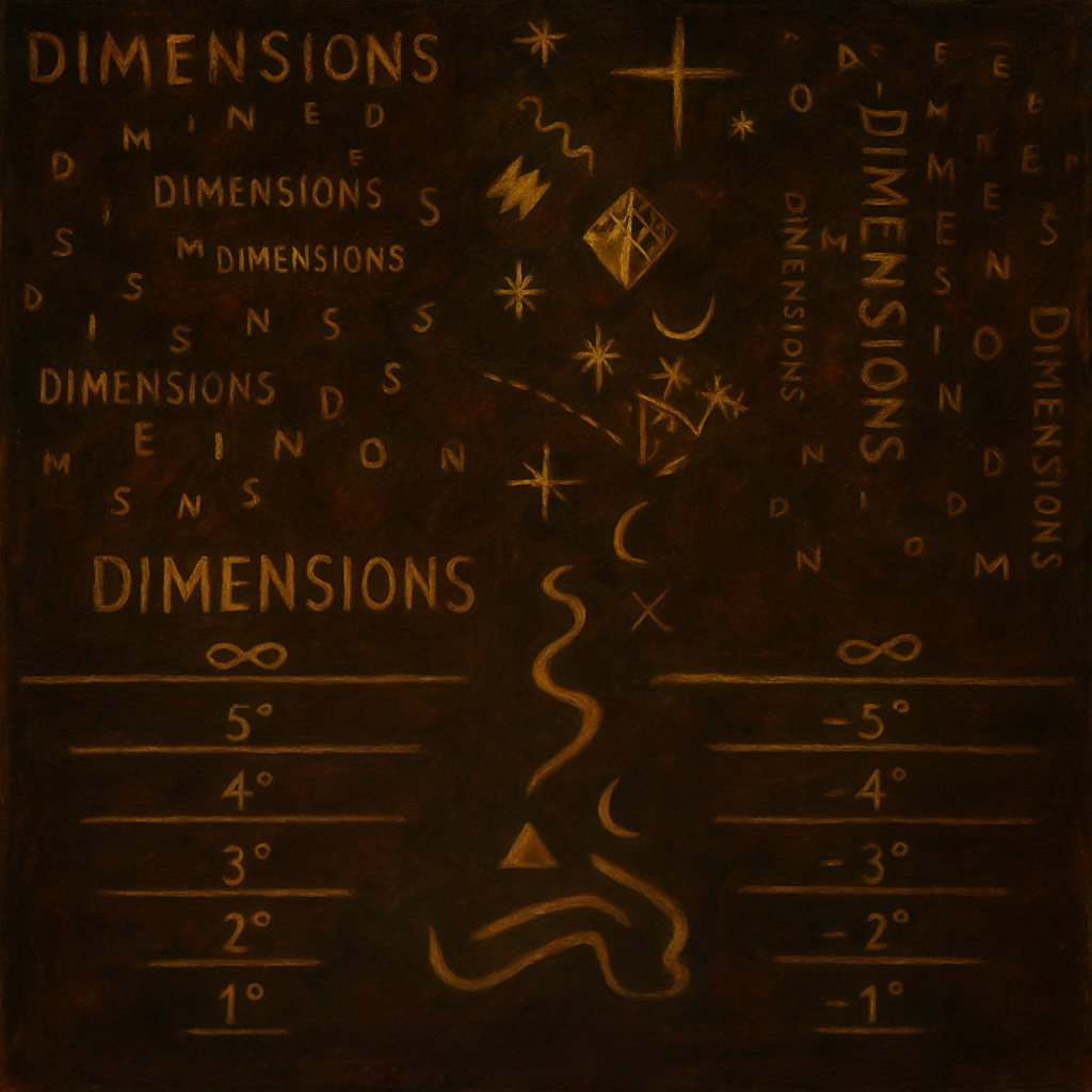 En el cuadro podemos ver como las dimensiones negativas están por debajo de las dimensiones, dejando claro la oposición que existen entre las dimensiones y las dimensiones negativas y que existen de diferente forma, de aquí que la palabra dimensiones están escritas en horizontal y las negativas en vertical denotando en la obra la diferencia que existen entre ambas dimensiones existentes.